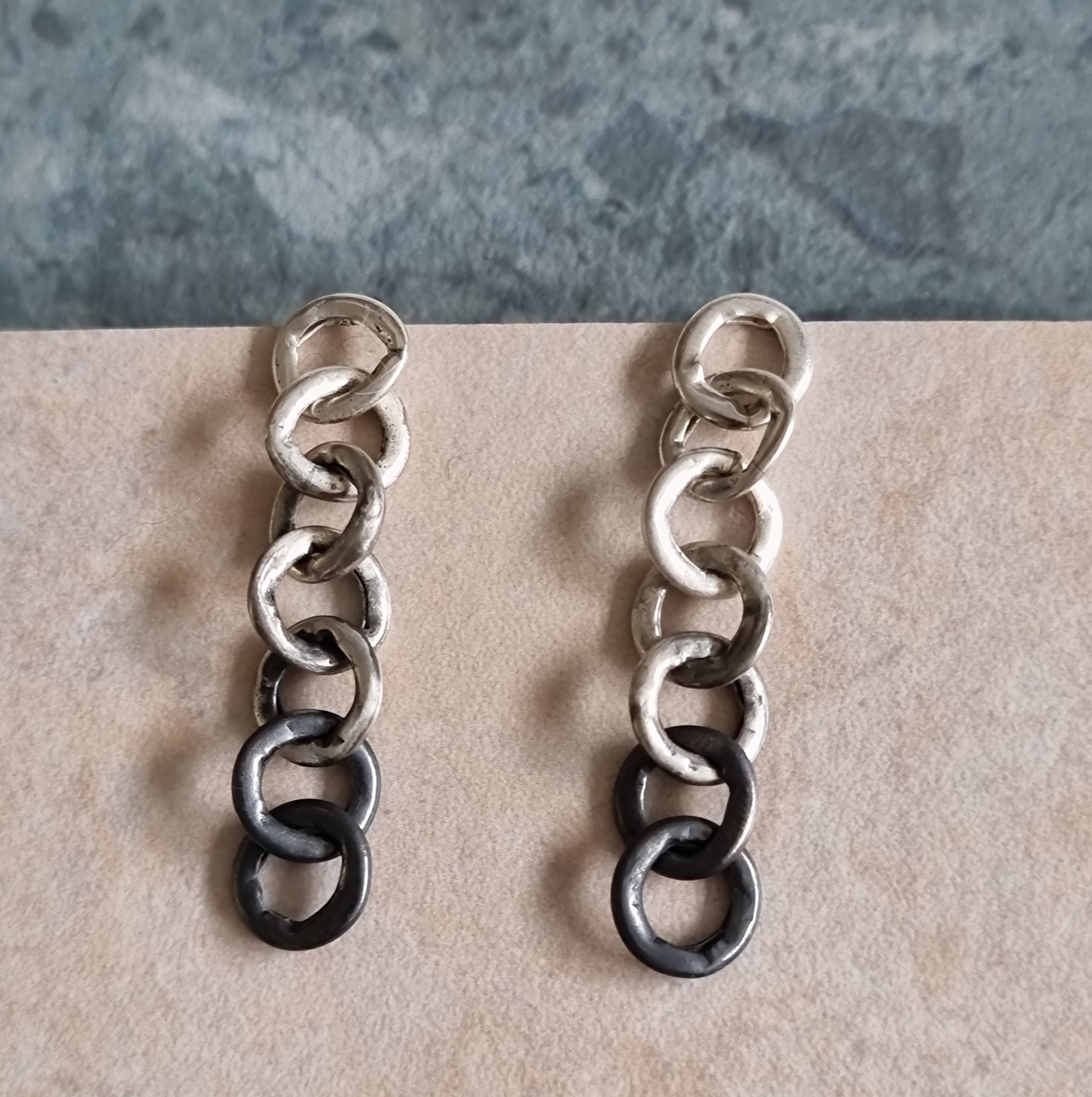 Part of my Relic series, these rugged stud earrings are made from reclaimed sterling silver belcher chain links – once whole, now transformed. I’ve flattened and partially oxidised the silver links to highlight their wear and history. These earrings create a gentle movement on the ears.