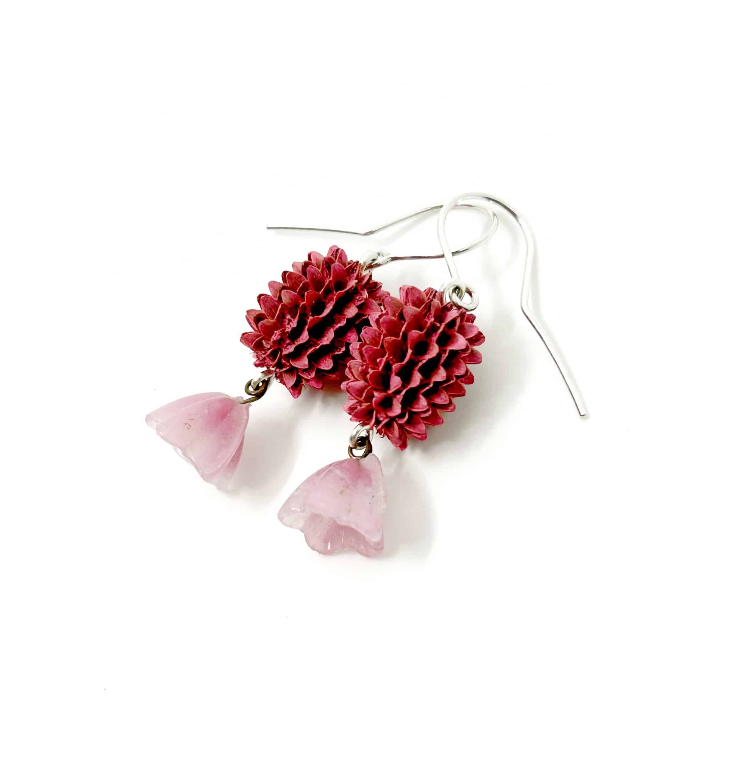 Ridged drops – Materials: Eucalyptus pods, sterling silver, copper, glass, acrylic paint Dimensions: 4.1 x 1.5 x 1.8 cm, $85